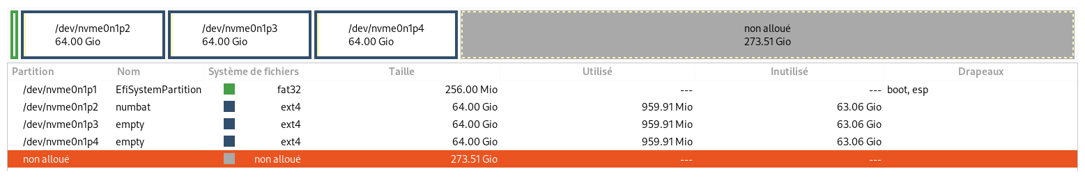 Je me suis battu pour essayer de partitionner le disque en sorte que windows s’installe là où je voulais, c’est à dire en début de disque. Il semble que ce n’est pas possible, ce truc fait ce qu’il veut. Aussi j'abandonne cette idée et lui laisse un espace non alloué en fin de disque où il peut poser sa crotte, dans autant de partitions qu'il veut. Comme attendu, le résultat est dégueulasse.
